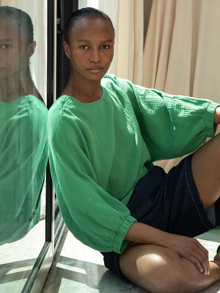 The Ivy is a beautiful, feminine, loose-fitting style. Featuring a round neck, scooped back, and batwing balloon 3/4 length sleeves with elasticated cuffs. Crafted from 100% Organic Cotton Cheesecloth for a comfortable and soft finish. A perfect addition to any outfit for the upcoming season and a timeless piece for years to come.