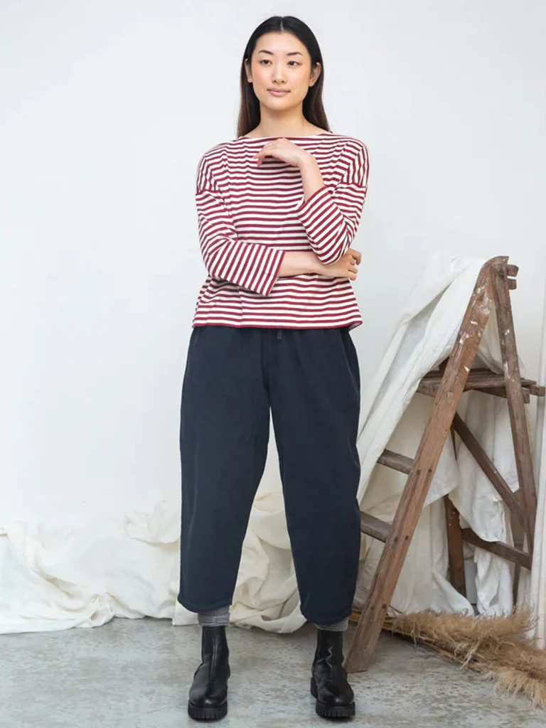 The Leia-Sue Top in Burgundy White from Beaumont Organic is a boxy cut top with a boat neckline, 3/4 length sleeve and drop shoulder. Crafted from 100% organic cotton jersey. Made in Portugal