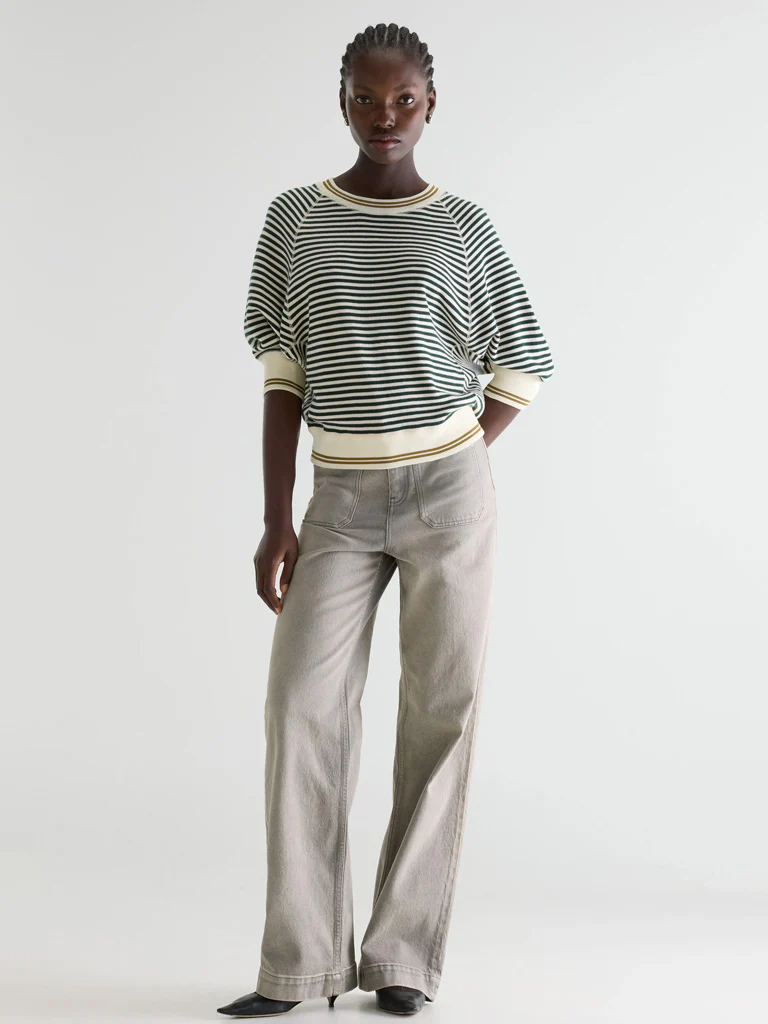 The Anglet Sweater in Green Ecru from Bellerose is an oversized crewneck sweater in ecru cotton with fine bottle green stripes, featuring 3/4 sleeves, ribbed edges and contrast mustard detail at collar and hem.