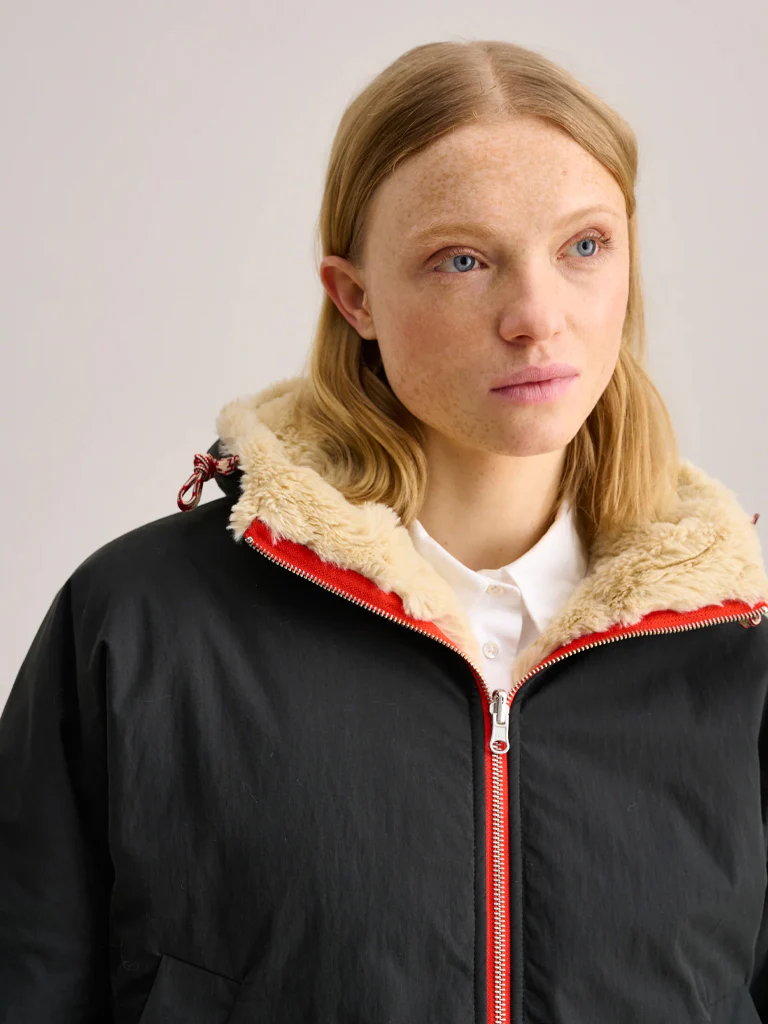 The Loud Jacket from Bellerose is ideal for keeping bad weather at bay. Multi-functional yet stylish, the jacket is reversible and hooded, with a cropped boxy but comfortable fit. Lined with faux fur and finished with elasticated waist and cuffs, contrasting drawstring, metal zip, and slightly longer in the back.