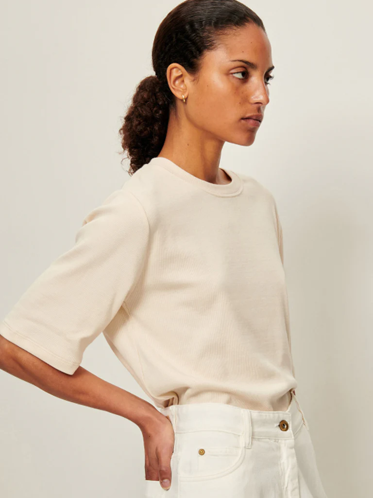 The Serge T-Shirt in Fleur de Sel from Sessun offers an oversized silhouette with short sleeves and a classic round neckline. Made from a fluid ribbed knit fabric enriched with a touch of stretch, it ensures both comfort and ease of movement. This versatile piece combines relaxed style with refined craftsmanship.